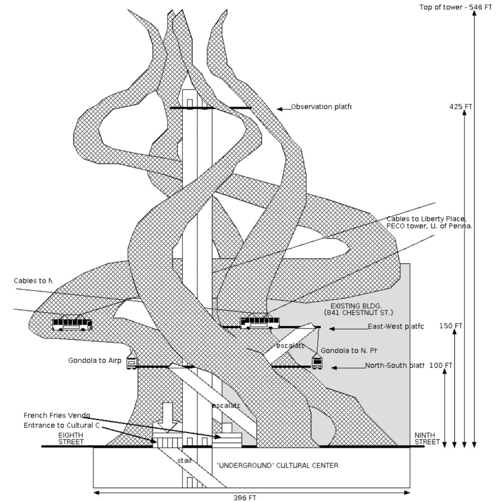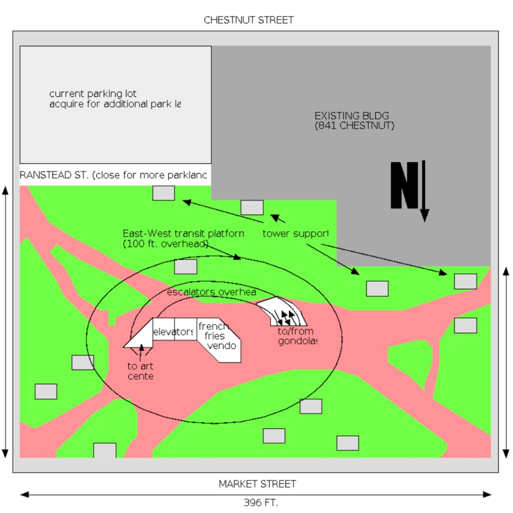 for the construction at 8th and Market streets of a world-class monument inspired by the Eiffel tower, which shall be integrated with a hub for aerially-suspended gondola transit, and which shall be accompanied by an ‘underground’ cultural center, a series of public benches and gardens, and a french fry vendor