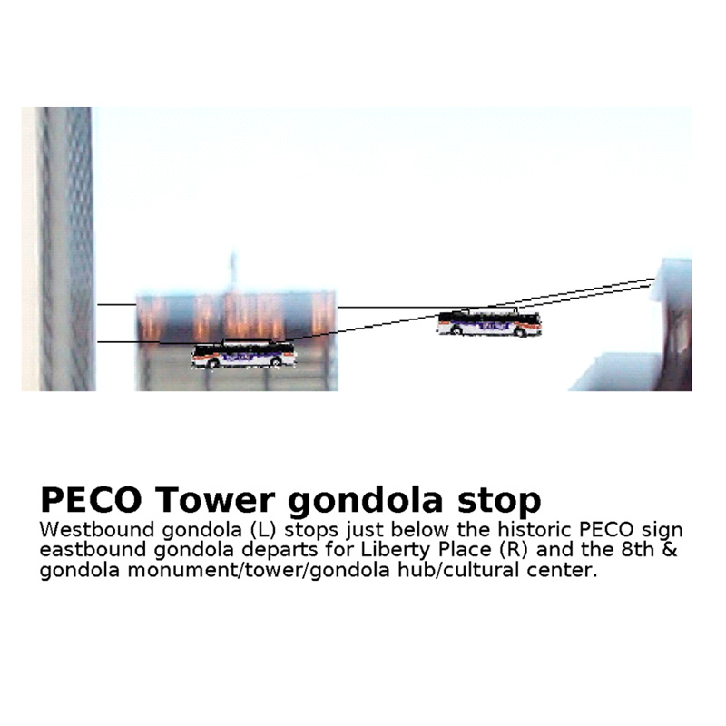 - Gondola Transit Hub and Network– Integrated with the tower will be a gondola transit hub to be operated by the Southeastern Pennsylvania Transportation Authority. Escalators, and wheelchair-accessible elevators will lead up the tower to a north-south platform six stories above street level and an east-west platform nine stories above street level. The proposed initial North-South route will have an endpoint at the Philadelphia International Airport (with dramatic views of planes taking off and landing under the gondola cables) and a northern terminus at a point in Northern Philadelphia to be determined after an expedition is sent to that territory and a report is written on its general landscape and resources. The proposed initial East-West route will begin in Camden, New Jersey and end on the campus of the University of Pennsylvania with stops at the top of Liberty Place and just below the historic scrolling PECO energy sign. The gondola system will be designed such that cables can be attached to existing SEPTA busses – thereby decreasing costs and allowing for express land/air routes that will bypass center city traffic.