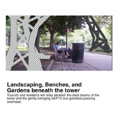 - Landscaping, Benches, Gardens – By developing the all ages music venue/cinema/skate park/puppet workshop aspect of the development underground and constructing a high tower with a minimal surface footprint, precious street-level open space will be retained and developed as parkland. This new parkland will serve to partially restore William Penn’s initial vision for a city in which enjoyable open space is easily accessible to all residents – a vision that has too often been blighted by buildings and high-speed roadways. Beneath the curving steel beams of the tower will grow trees, shrubbery and flowers. In the grass, it will be common to see young men tossing a base-ball – sport coats thrown aside. In the pathways, women with short hair and tattoos will walk dogs. On the wooden benches women in wide-brimmed sunhats will use the dogs as a good excuse to strike up a conversation and aging men will read periodicals or sleep as SEPTA busses silently sway overhead on the gently sagging high-tension cables. Amongst the shrubbery, squirrels and pigeons will grow plump on discarded french fries.